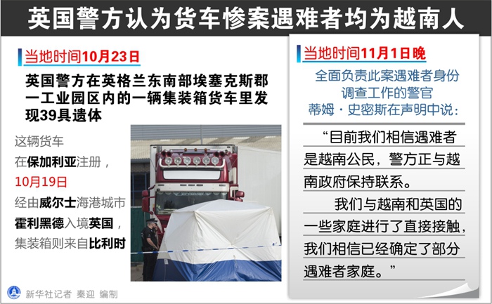 新華社倫敦11月1日電(記者張代蕾)英國(guó)埃塞克斯郡警方11月1日晚發(fā)表聲明說(shuō),警方目前認(rèn)為上月發(fā)生的貨車(chē)慘案39名遇難者均為越南人。
