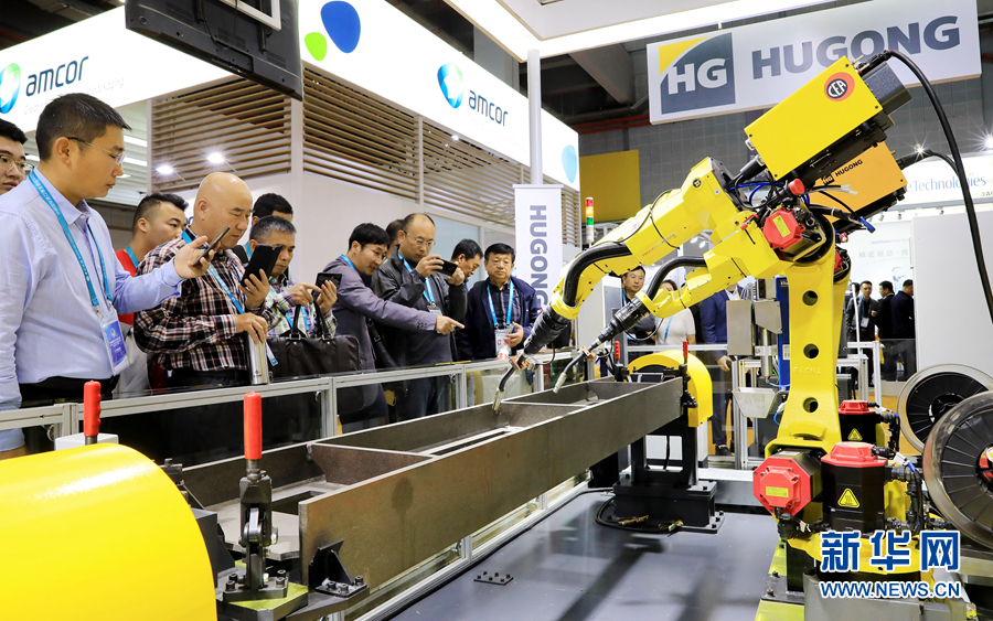11月6日,在進(jìn)博會裝備展區(qū),一組正在進(jìn)行作業(yè)演示的焊接機器人吸引了參觀者的目光。當(dāng)日是第二屆中國國際進(jìn)口博覽會開幕第二天,上海國家會展中心迎來首個“大客流”。新華社記者 方喆 攝