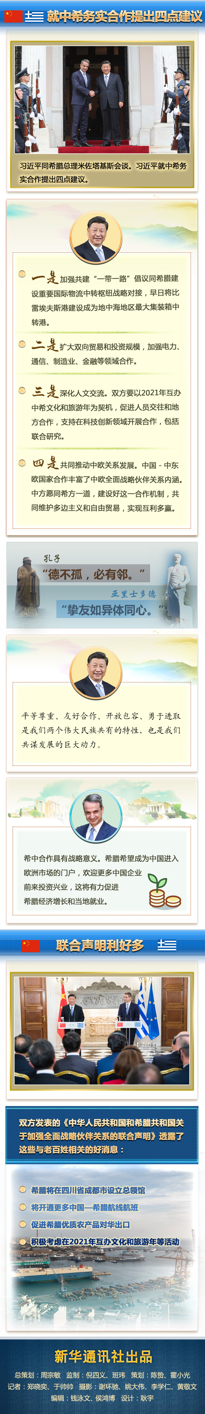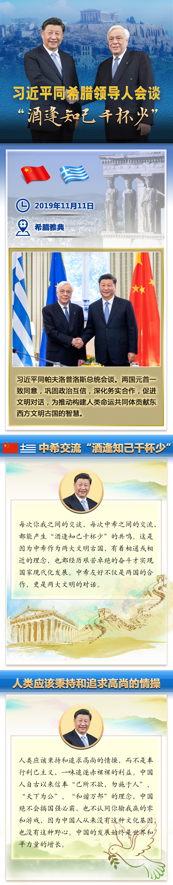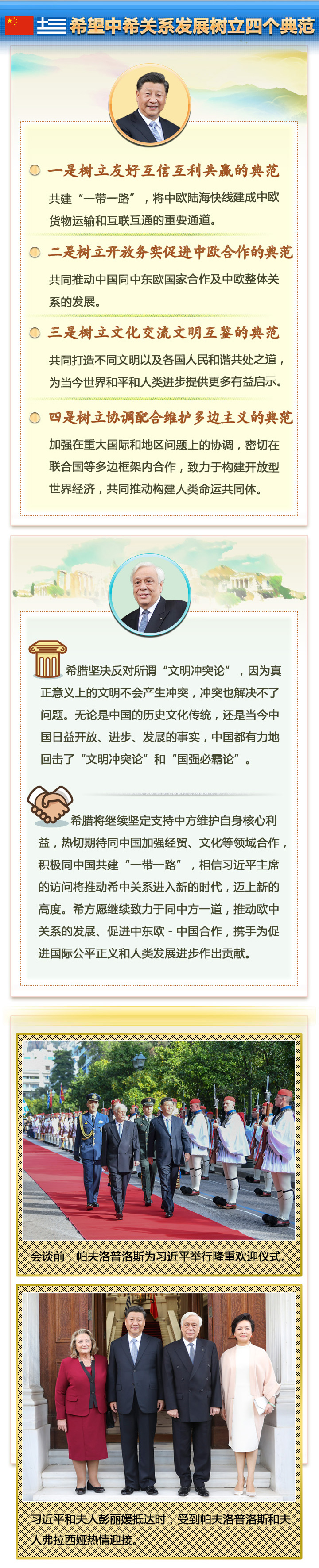 新華社雅典11月12日電 國家主席習(xí)近平11月10日晚抵達(dá)雅典,開始對希臘進行國事訪問。11日上午,習(xí)主席的訪問活動異常密集:向希臘無名戰(zhàn)士紀(jì)念碑獻(xiàn)花圈,出席希臘總統(tǒng)帕夫洛普洛斯舉行的隆重歡迎儀式并同帕夫洛普洛斯舉行會談,旋即又同總理米佐塔基斯舉行會談、出席合作文本交換儀式、共同會見記者。中希兩國領(lǐng)導(dǎo)人就雙邊關(guān)系及共同關(guān)心的國際和地區(qū)問題深入交換意見,達(dá)成廣泛共識。