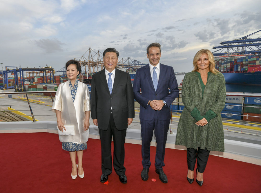 這是習(xí)近平和夫人彭麗媛同米佐塔基斯夫婦在港口樓頂平臺合影。新華社記者謝環(huán)馳攝