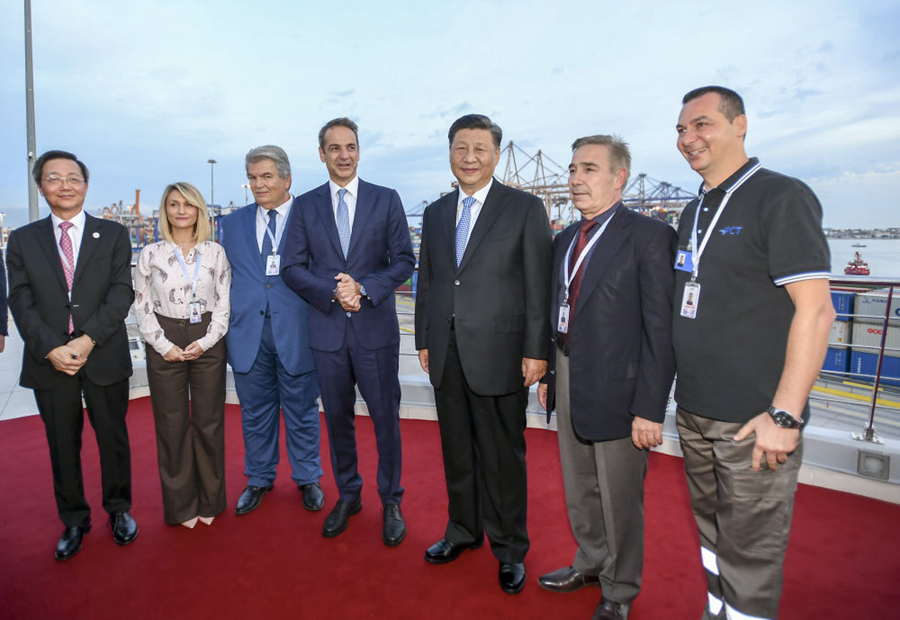 這是習(xí)近平夫婦和米佐塔基斯夫婦同中遠(yuǎn)當(dāng)?shù)貑T工等合影。新華社記者黃敬文攝