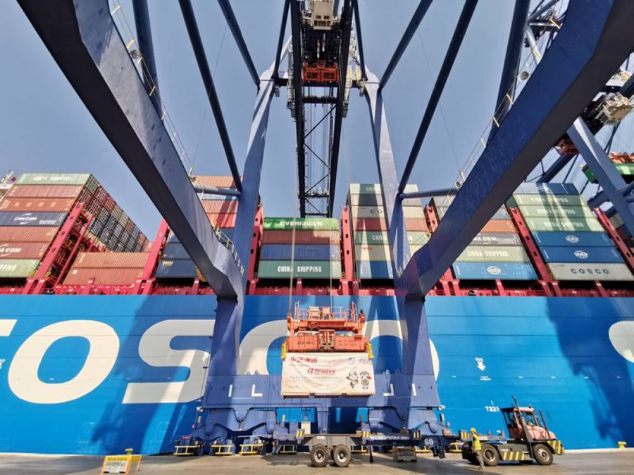 ??吭诒壤装7蛩垢鄣募b箱船“中遠(yuǎn)海運(yùn)獅子座”和“中遠(yuǎn)海運(yùn)比利時”。新華社記者霍小光攝