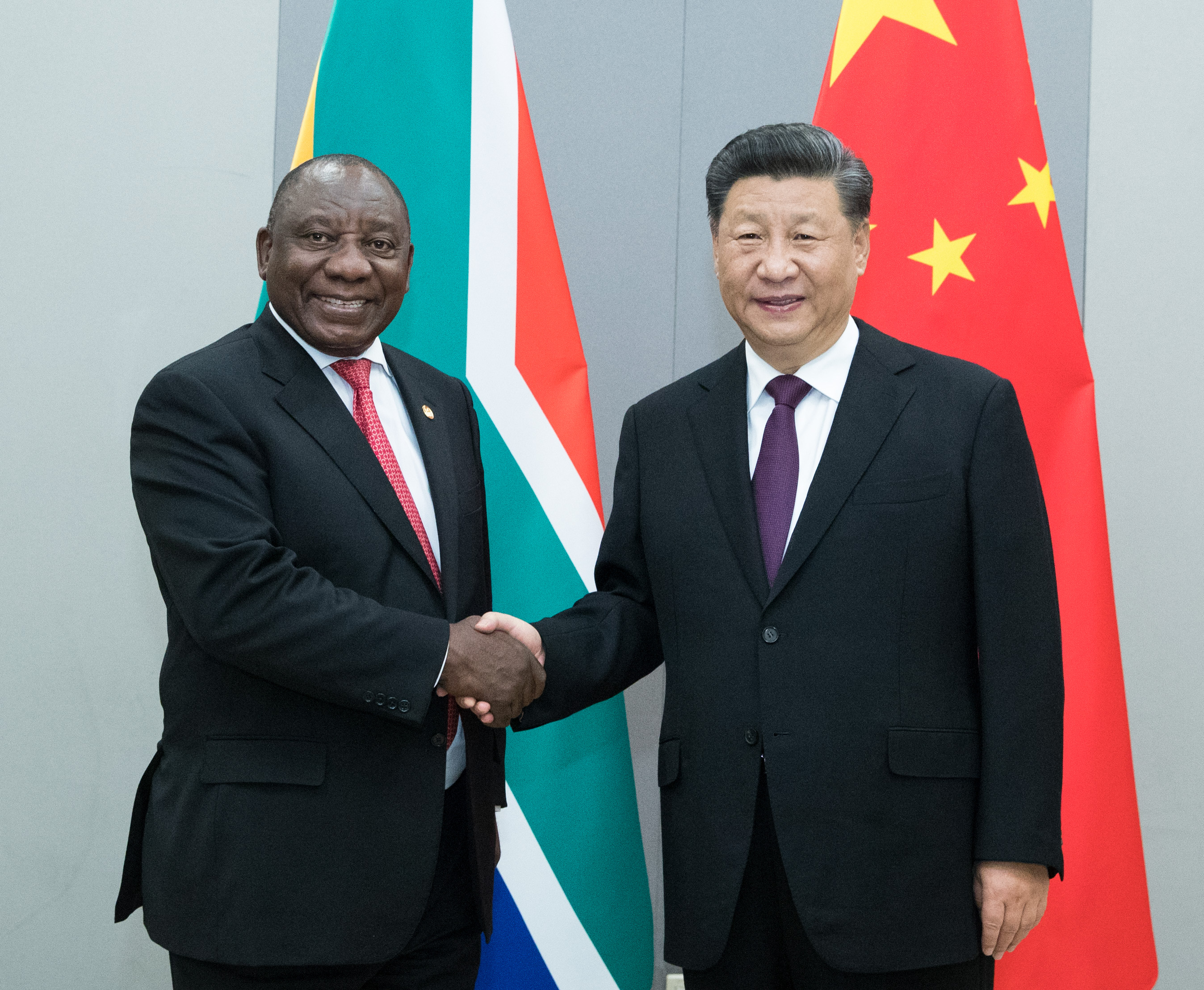 ▲當(dāng)?shù)貢r(shí)間11月14日,國家主席習(xí)近平在巴西利亞會見南非總統(tǒng)拉馬福薩。新華社記者王曄攝