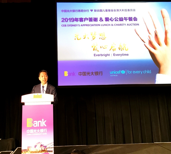 中國光大銀行悉尼分行行長于洪德在拍賣會開始前致辭說,光大銀行衷心感謝廣大客戶和合作伙伴對其業(yè)務(wù)發(fā)展的支持,希望通過慈善拍賣為澳大利亞兒童健康成長盡一份力、作更多貢獻(xiàn)。