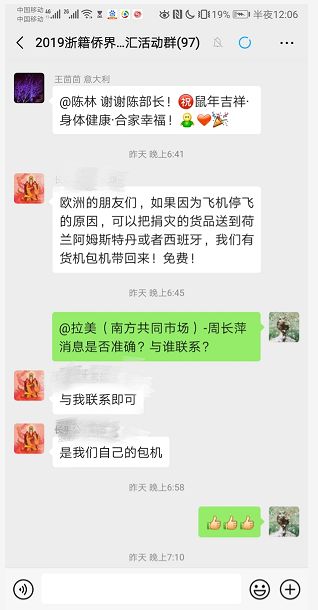 2月1日晚,浙江省僑界名媛匯微信群里的一則信息引起了大家的注意?!皻W洲的朋友們,如果因為飛機停飛的原因,可以把捐災(zāi)的貨品送到荷蘭阿姆斯特丹或者西班牙,我們有貨機包機帶回來!免費!”群里瞬間沸騰,求助信息紛至沓來。省僑聯(lián)黨組書記、主席連小敏捕捉到這一信息,隨即高度重視,求證確認后,第一時間研究討論,展開部署。