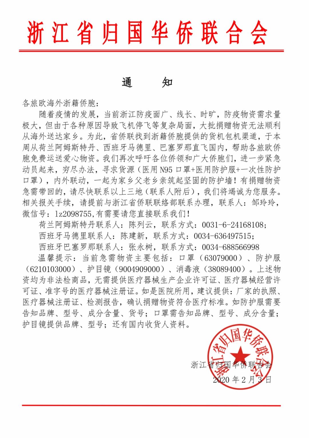 大疫當(dāng)前爭分奪秒。2月3日,一則浙江省歸國華僑聯(lián)合會聯(lián)系貨運包機直飛國內(nèi)尋求抗疫捐贈物資的通知,將眾多歐洲華僑華人凝聚在一起。