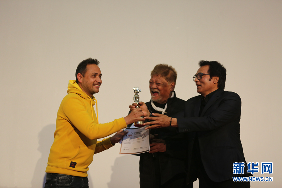 2月17日,第三屆尼泊爾國際電影節(jié)的閉幕儀式在加德滿都市政大廳內舉行,資深電影人士正在給獲獎者(左)頒獎。本屆電影節(jié)2月13日開始,一共有來自40個國家和地區(qū)的80部影片入選,其中中國和哈薩克斯坦聯(lián)合拍攝的《音樂家》作為開幕電影,備受關注。記者 唐薇 攝?