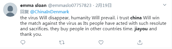 推特用戶emma sloan說:病毒將會消失,人類將會獲勝。我相信中國將會打敗病毒,因?yàn)橹袊嗣癫扇×藞?jiān)決且富有犧牲精神的行動。他們給其他國家的人民爭取了時間。加油,謝謝你們。