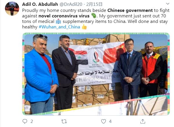 推特用戶Adil O. Abdullah說:我的祖國支持中國政府抗擊新冠肺炎病毒,我為此感到驕傲。我們的政府向中國送去了70噸的醫(yī)療補(bǔ)給物資,干得不錯。武漢和全中國都要平安康泰。