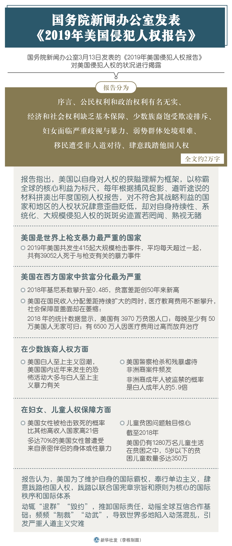 新華社北京3月13日電(記者王子銘、張?jiān)讫垼﹪?guó)務(wù)院新聞辦公室13日發(fā)表《2019年美國(guó)侵犯人權(quán)報(bào)告》,對(duì)美國(guó)侵犯人權(quán)的狀況進(jìn)行揭露。