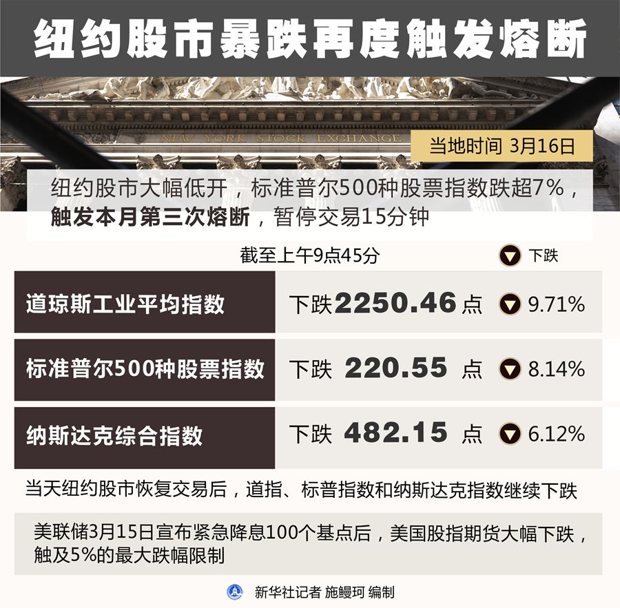 由于新冠肺炎疫情在美國持續(xù)擴(kuò)散引發(fā)市場(chǎng)廣泛擔(dān)憂,紐約股市16日開盤暴跌,并再次觸發(fā)7%的熔斷點(diǎn)。交易重啟后跌幅擴(kuò)大,收盤時(shí)紐約股市三大股指均暴跌超過11%。