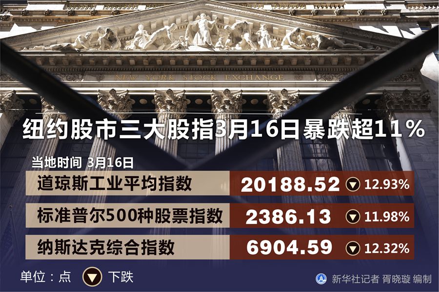 16日,紐約股市開(kāi)盤暴跌,并再次觸發(fā)7%的熔斷點(diǎn),交易重啟后跌幅擴(kuò)大。截至收盤,道瓊斯工業(yè)平均指數(shù)下跌2997.10點(diǎn),跌幅為12.93%;標(biāo)準(zhǔn)普爾500種股票指數(shù)下跌324.89點(diǎn),跌幅為11.98%;納斯達(dá)克綜合指數(shù)則下跌了970.28點(diǎn),跌幅為12.32%。