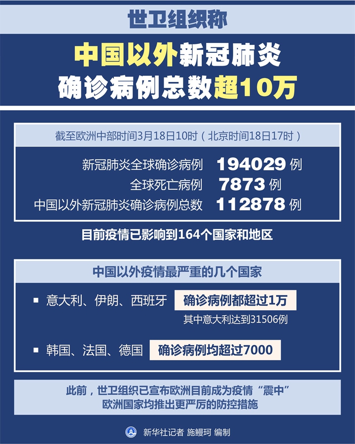 新華社日內(nèi)瓦3月18日電(記者劉曲)世界衛(wèi)生組織18日的最新數(shù)據(jù)顯示,中國以外新冠肺炎確診病例總數(shù)已超10萬,達(dá)到112878例。
