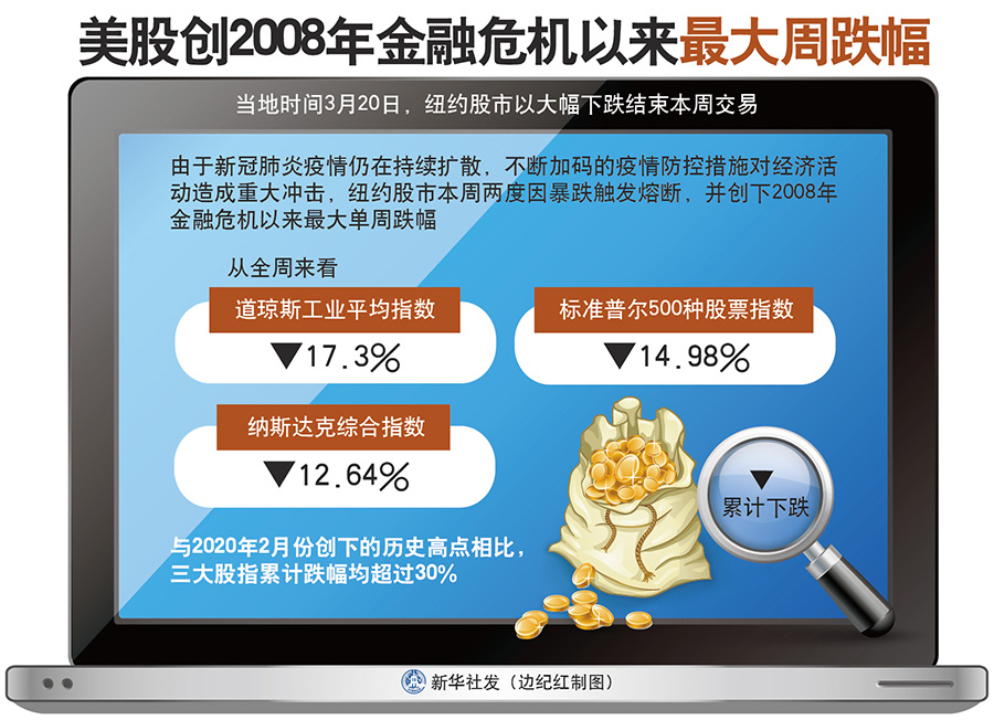 新華社紐約3月20日電 綜述:美股創(chuàng)2008年金融危機(jī)以來最大周跌幅
