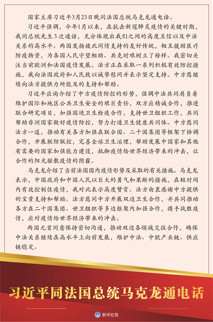 新華社北京3月23日電? 國家主席習近平23日晚同法國總統(tǒng)馬克龍通電話。