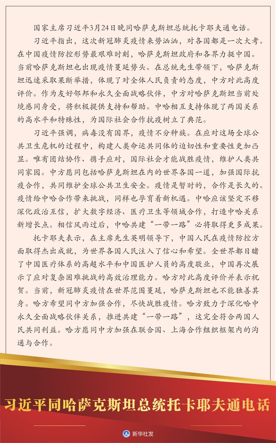 習(xí)近平指出,這次新冠肺炎疫情來(lái)勢(shì)洶洶,對(duì)各國(guó)都是一次大考。在中國(guó)疫情防控形勢(shì)最艱難時(shí)刻,哈薩克斯坦政府和各界力挺中國(guó)。當(dāng)前哈薩克斯坦也出現(xiàn)疫情蔓延勢(shì)頭。在總統(tǒng)先生帶領(lǐng)下,哈薩克斯坦迅速采取果斷舉措,體現(xiàn)了對(duì)全體人民負(fù)責(zé)的態(tài)度,中方對(duì)此高度評(píng)價(jià)。作為友好鄰邦和永久全面戰(zhàn)略伙伴,中方對(duì)哈薩克斯坦當(dāng)前處境感同身受,將積極提供支持和幫助。中哈相互支持體現(xiàn)了兩國(guó)關(guān)系的高水平和特殊性,為國(guó)際社會(huì)合作抗疫樹(shù)立了典范。