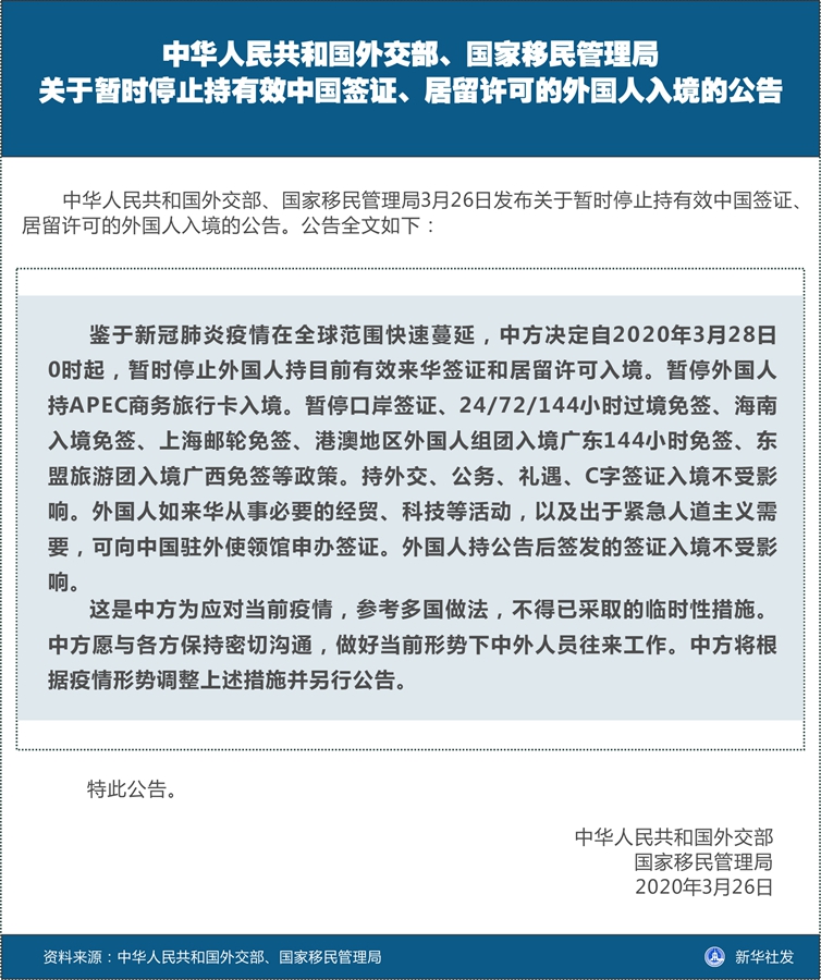 中華人民共和國(guó)外交部、國(guó)家移民管理局關(guān)于暫時(shí)停止持有效中國(guó)簽證、居留許可的外國(guó)人入境的公告-新華網(wǎng)