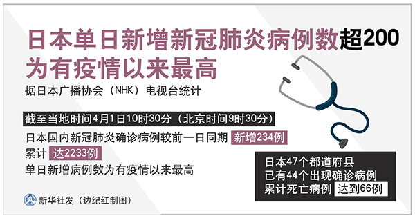 新華社東京4月1日電(記者華義)據(jù)日本廣播協(xié)會(NHK)電視臺統(tǒng)計,截至當?shù)貢r間4月1日10時30分(北京時間9時30分),日本國內(nèi)新冠肺炎確診病例較前一日同期新增234例,累計達2233例;單日新增病例數(shù)為有疫情以來最高。