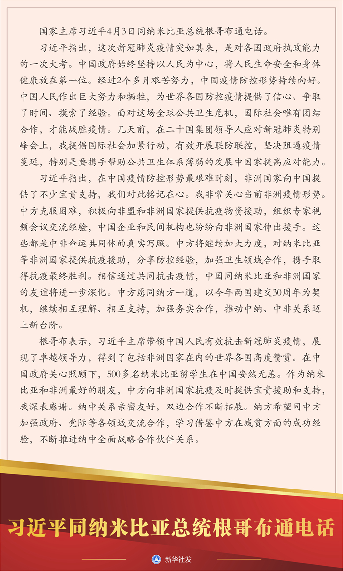 新華社北京4月3日電 國(guó)家主席習(xí)近平3日同納米比亞總統(tǒng)根哥布通電話。