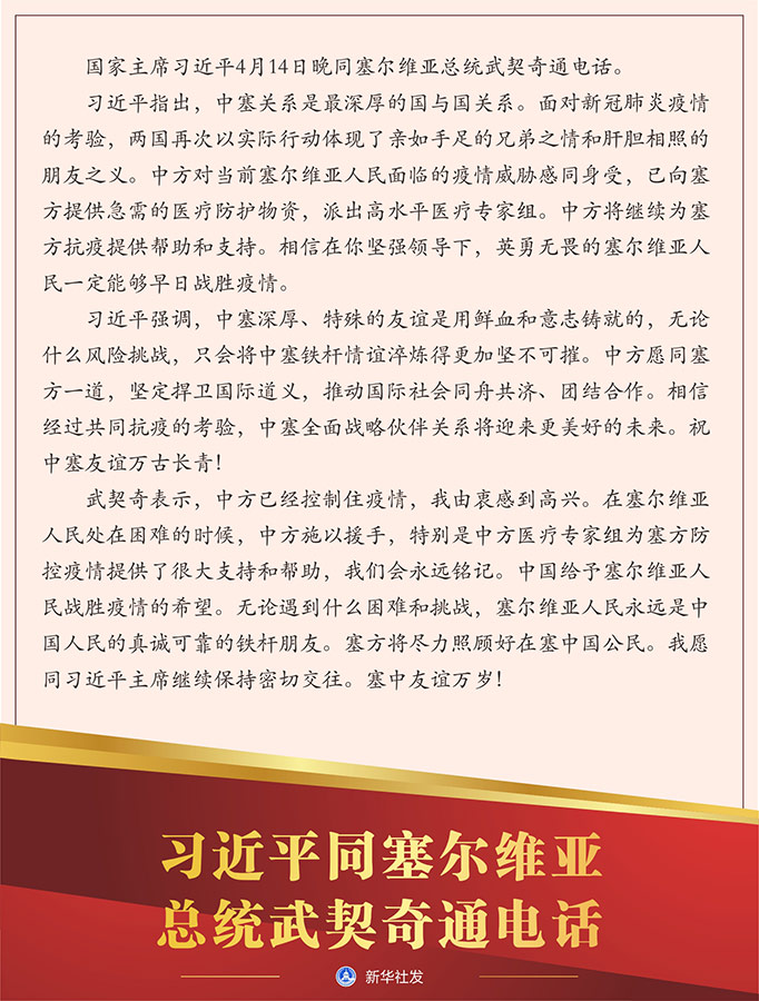 習(xí)近平指出,中塞關(guān)系是最深厚的國與國關(guān)系。面對新冠肺炎疫情的考驗(yàn),兩國再次以實(shí)際行動體現(xiàn)了親如手足的兄弟之情和肝膽相照的朋友之義。中方對當(dāng)前塞爾維亞人民面臨的疫情威脅感同身受,已向塞方提供急需的醫(yī)療防護(hù)物資,派出高水平醫(yī)療專家組。中方將繼續(xù)為塞方抗疫提供幫助和支持。相信在你堅(jiān)強(qiáng)領(lǐng)導(dǎo)下,英勇無畏的塞爾維亞人民一定能夠早日戰(zhàn)勝疫情。