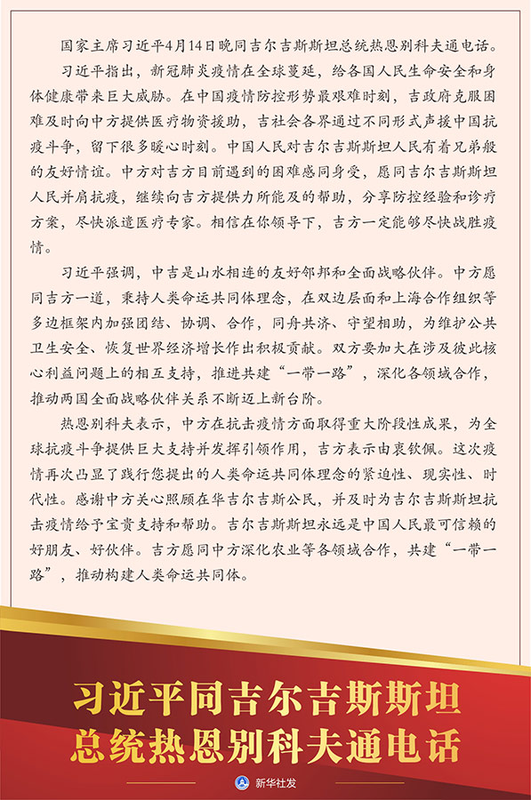新華社北京4月14日電 國(guó)家主席習(xí)近平14日晚同吉爾吉斯斯坦總統(tǒng)熱恩別科夫通電話(huà)。
