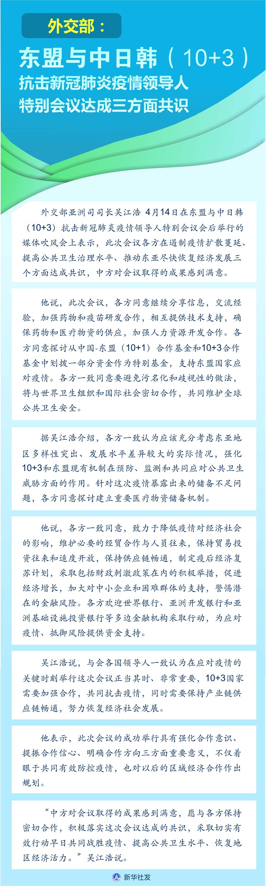 新華社北京4月14日電(記者伍岳)外交部亞洲司司長(zhǎng)吳江浩14日在東盟與中日韓(10+3)抗擊新冠肺炎疫情領(lǐng)導(dǎo)人特別會(huì)議會(huì)后舉行的媒體吹風(fēng)會(huì)上表示,此次會(huì)議各方在遏制疫情擴(kuò)散蔓延、提高公共衛(wèi)生治理水平、推動(dòng)?xùn)|亞盡快恢復(fù)經(jīng)濟(jì)發(fā)展三個(gè)方面達(dá)成共識(shí),中方對(duì)會(huì)議取得的成果感到滿意。