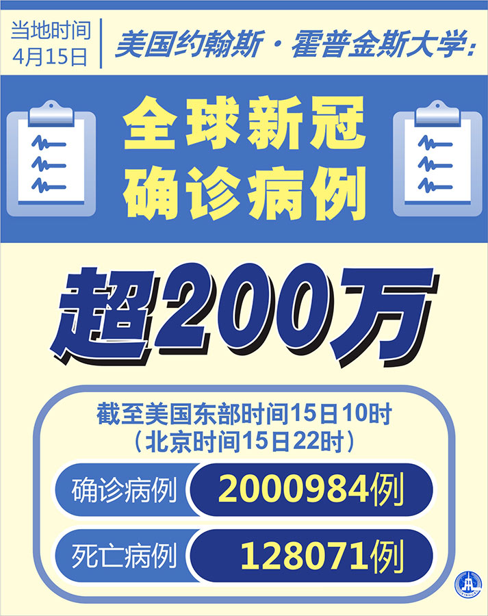 新華社紐約4月15日電 美國約翰斯·霍普金斯大學(xué)15日發(fā)布的新冠疫情最新統(tǒng)計數(shù)據(jù)顯示,截至美國東部時間15日10時(北京時間15日22時),全球新冠確診病例達2000984例,死亡病例為128071例。