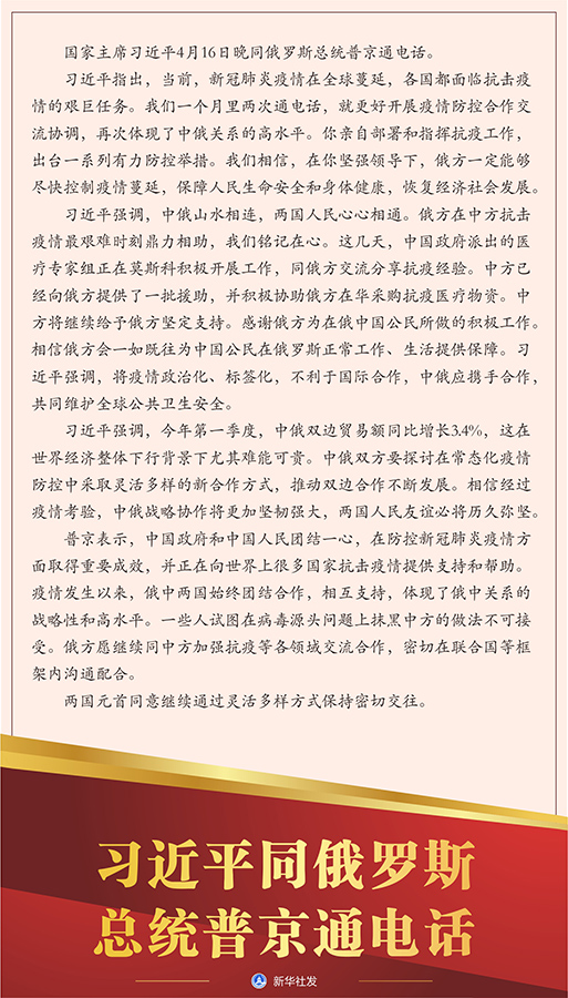 習(xí)近平強(qiáng)調(diào),中俄山水相連,兩國(guó)人民心心相通。俄方在中方抗擊疫情最艱難時(shí)刻鼎力相助,我們銘記在心。這幾天,中國(guó)政府派出的醫(yī)療專家組正在莫斯科積極開(kāi)展工作,同俄方交流分享抗疫經(jīng)驗(yàn)。中方已經(jīng)向俄方提供了一批援助,并積極協(xié)助俄方在華采購(gòu)抗疫醫(yī)療物資。中方將繼續(xù)給予俄方堅(jiān)定支持。感謝俄方為在俄中國(guó)公民所做的積極工作。相信俄方會(huì)一如既往為中國(guó)公民在俄羅斯正常工作、生活提供保障。習(xí)近平強(qiáng)調(diào),將疫情政治化、標(biāo)簽化,不利于國(guó)際合作,中俄應(yīng)攜手合作,共同維護(hù)全球公共衛(wèi)生安全。