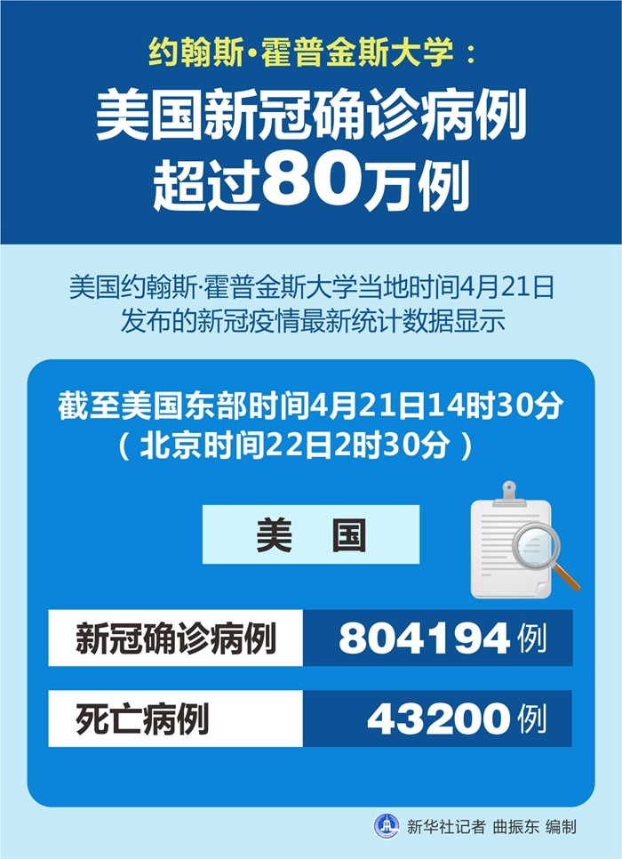 新華社紐約4月21日電? 美國約翰斯·霍普金斯大學(xué)21日發(fā)布的新冠疫情最新統(tǒng)計數(shù)據(jù)顯示,截至美國東部時間21日14時30分(北京時間22日2時30分),美國新冠確診病例升至804194例,死亡病例為43200例。
