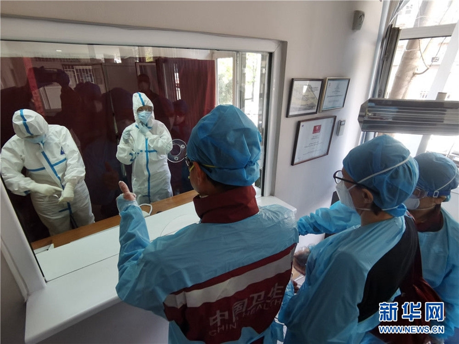 4月11日,在塞爾維亞首都貝爾格萊德,中國赴塞爾維亞抗疫醫(yī)療專家組在貝爾格萊德一所門診走訪,為醫(yī)護(hù)人員的防護(hù)意識點贊。新華社發(fā)(中國赴塞爾維亞抗疫醫(yī)療專家組供圖)