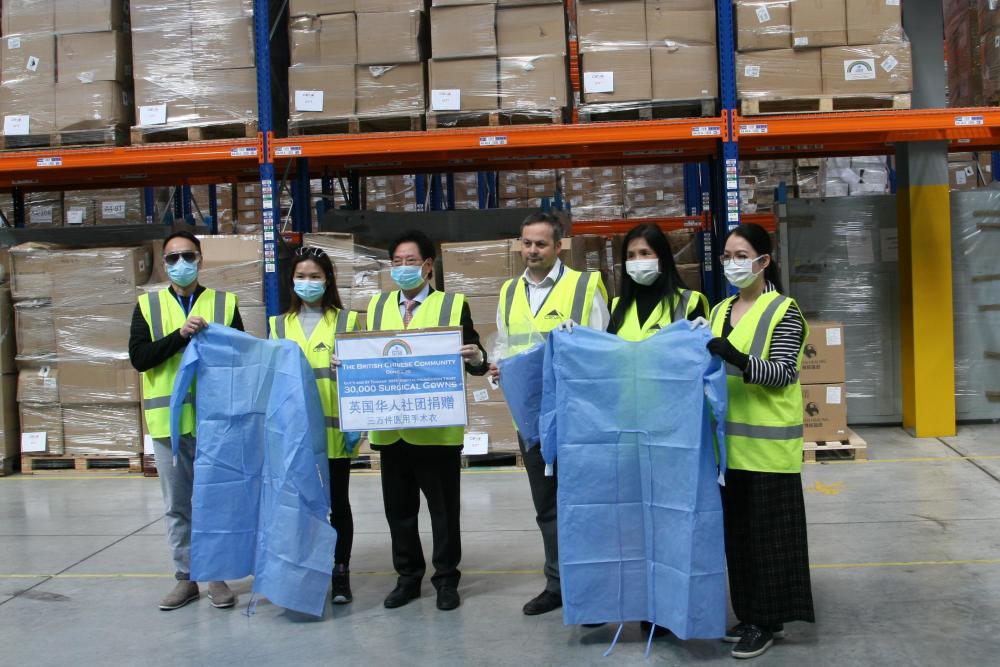2020年4月20日,英國華僑華人社團向英方捐贈醫(yī)用防護服。(新華社發(fā))