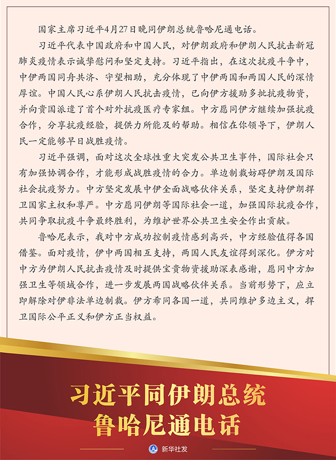 習近平代表中國政府和中國人民,對伊朗政府和伊朗人民抗擊新冠肺炎疫情表示誠摯慰問和堅定支持。習近平指出,在這次抗疫斗爭中,中伊兩國同舟共濟、守望相助,充分體現(xiàn)了中伊兩國和兩國人民的深情厚誼。中國人民心系伊朗人民抗擊疫情,已向伊方援助多批抗疫物資,并向貴國派遣了首個對外抗疫醫(yī)療專家組。中方愿同伊方繼續(xù)加強抗疫合作,分享抗疫經驗,提供力所能及的幫助。相信在你領導下,伊朗人民一定能夠早日戰(zhàn)勝疫情。