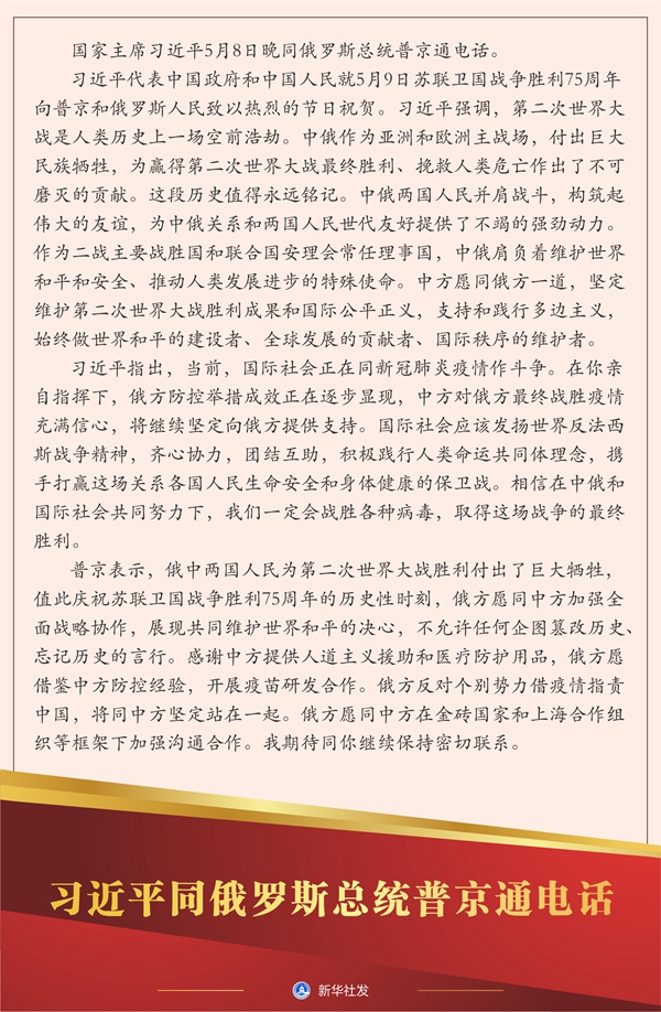 新華社北京5月8日電? 國(guó)家主席習(xí)近平5月8日晚同俄羅斯總統(tǒng)普京通電話。