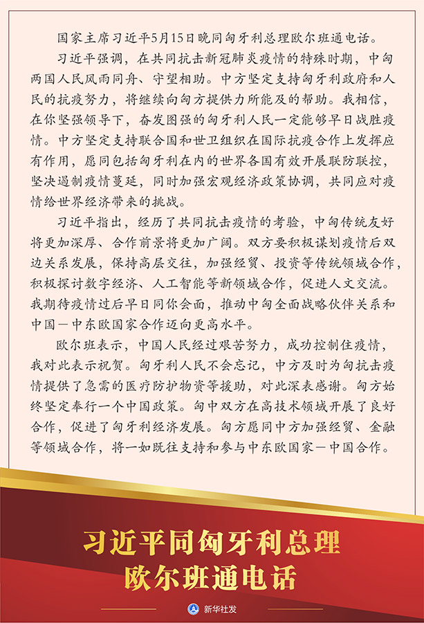 新華社北京5月15日電 國家主席習近平5月15日晚同匈牙利總理歐爾班通電話。
