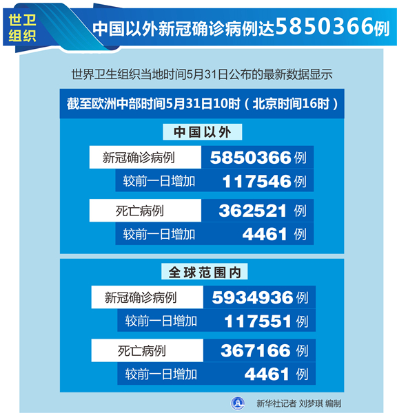新華社日內(nèi)瓦5月31日電(記者劉曲)世界衛(wèi)生組織31日公布的最新數(shù)據(jù)顯示,中國以外新冠確診病例達到5850366例。