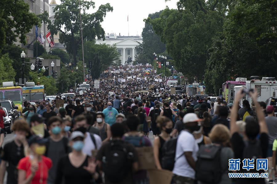 6月6日,人們在美國華盛頓白宮附近游行。美國首都迎來了十幾天來參與人數(shù)最多的游行活動。新華社記者 劉杰 攝