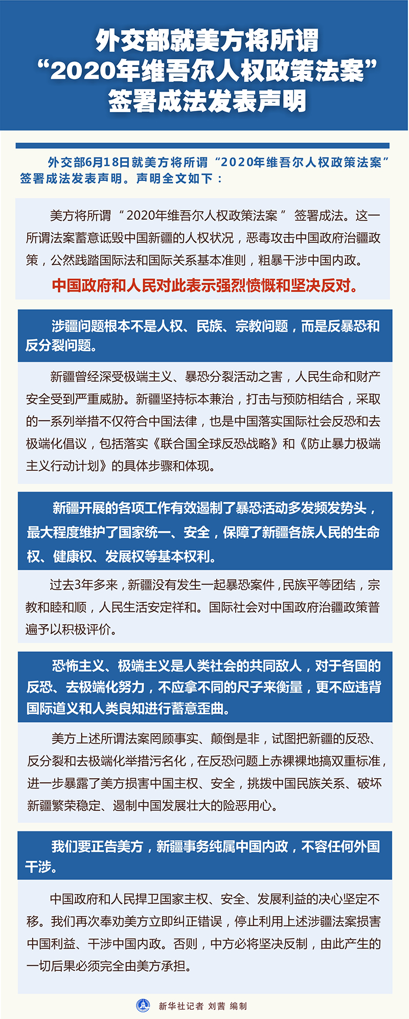 美方將所謂“2020年維吾爾人權政策法案”簽署成法。這一所謂法案蓄意詆毀中國新疆的人權狀況,惡毒攻擊中國政府治疆政策,公然踐踏國際法和國際關系基本準則,粗暴干涉中國內政。中國政府和人民對此表示強烈憤慨和堅決反對。