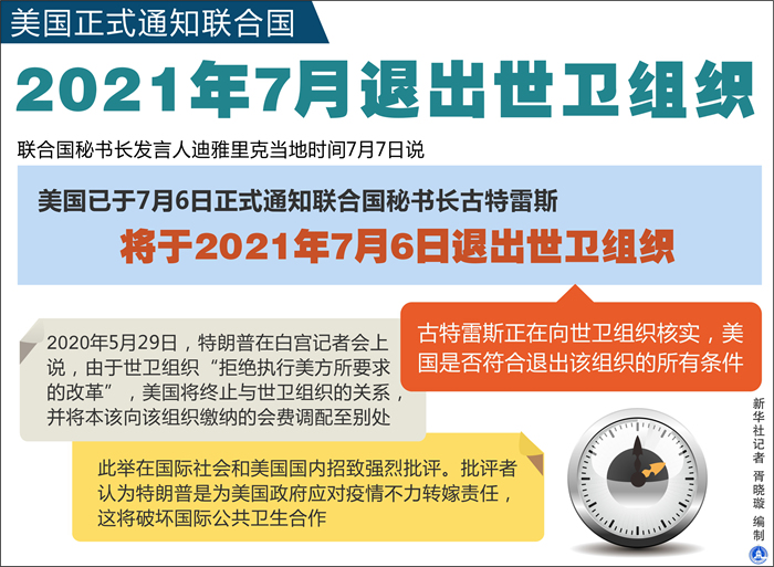 迪雅里克當(dāng)天通過郵件向媒體證實(shí),美國已于6日正式通知古特雷斯,將于2021年7月6日退出世衛(wèi)組織。古特雷斯正在向世衛(wèi)組織核實(shí),美國是否符合退出該組織的所有條件。