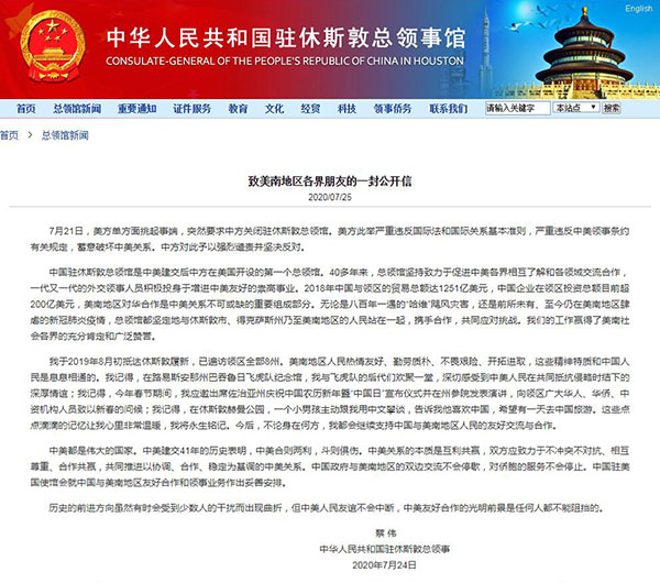 7月21日,美方單方面挑起事端,突然要求中方關(guān)閉駐休斯敦總領(lǐng)館。美方此舉嚴(yán)重違反國(guó)際法和國(guó)際關(guān)系基本準(zhǔn)則,嚴(yán)重違反中美領(lǐng)事條約有關(guān)規(guī)定,蓄意破壞中美關(guān)系。中方對(duì)此予以強(qiáng)烈譴責(zé)并堅(jiān)決反對(duì)。