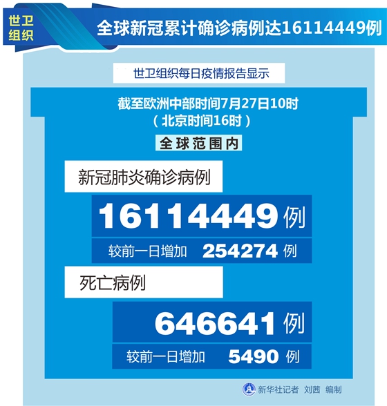 世衛(wèi)組織每日疫情報(bào)告顯示,截至歐洲中部時(shí)間27日10時(shí)(北京時(shí)間16時(shí)),全球確診病例較前一日增加254274例,達(dá)到16114449例;死亡病例增加5490例,達(dá)到646641例。