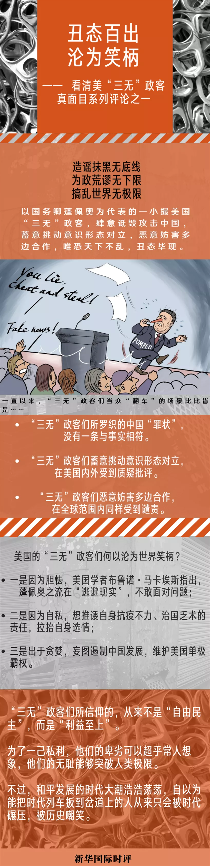 一段時(shí)間以來,以國務(wù)卿蓬佩奧為代表的一小撮造謠抹黑無底線、為政荒謬無下限、搞亂世界無極限的美國“三無”政客,肆意詆毀攻擊中國,蓄意挑動(dòng)意識(shí)形態(tài)對立,惡意妨害多邊合作,唯恐天下不亂,丑態(tài)畢現(xiàn)。