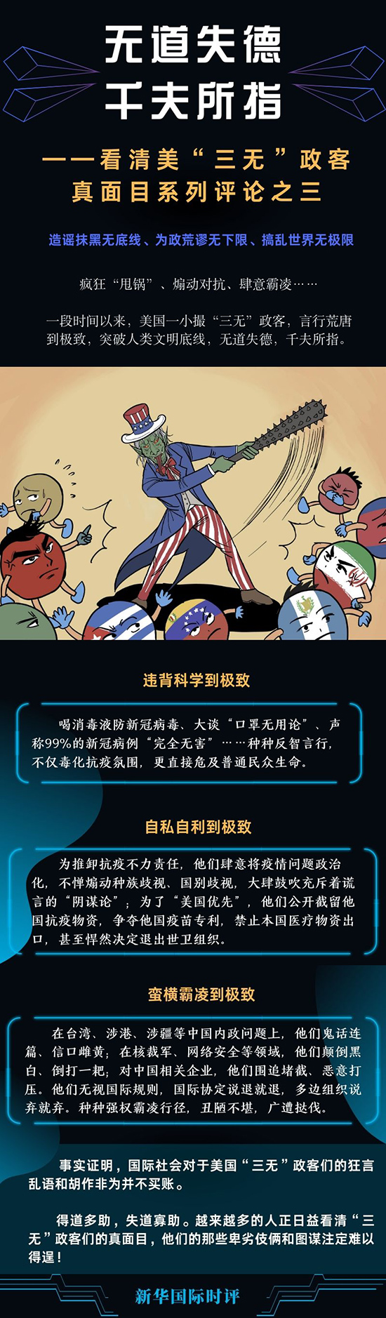 瘋狂“甩鍋”、煽動(dòng)對(duì)抗、肆意霸凌……一段時(shí)間以來,美國一小撮造謠抹黑無底線、為政荒謬無下限、搞亂世界無極限的“三無”政客,言行荒唐到極致,突破人類文明底線,無道失德,千夫所指。