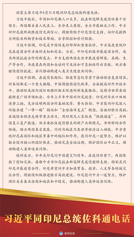習(xí)近平指出,中國和印尼都人口眾多,抗擊新冠肺炎疫情任務(wù)十分艱巨。兩國都本著人民至上、生命至上原則,全力開展相關(guān)工作。中方對印尼最終戰(zhàn)勝疫情充滿信心,將繼續(xù)給予印尼堅定支持,向印尼提供力所能及的物資和技術(shù)幫助,分享防控和診療經(jīng)驗。