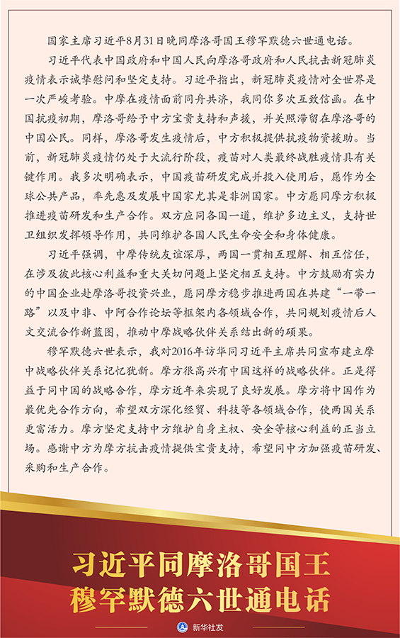 新華社北京8月31日電 國(guó)家主席習(xí)近平8月31日晚同摩洛哥國(guó)王穆罕默德六世通電話。
