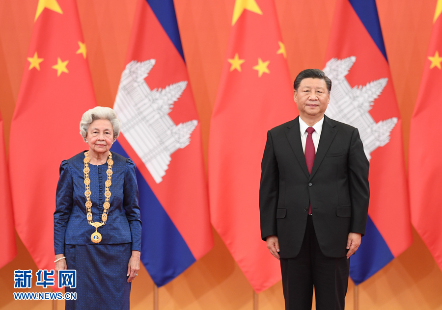 11月6日,國(guó)家主席習(xí)近平在北京人民大會(huì)堂為柬埔寨太后莫尼列舉行中華人民共和國(guó)“友誼勛章”頒授儀式。 新華社記者 張領(lǐng) 攝