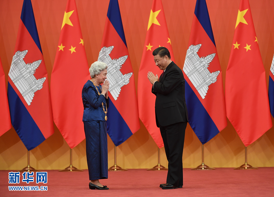 11月6日,國(guó)家主席習(xí)近平在北京人民大會(huì)堂為柬埔寨太后莫尼列舉行中華人民共和國(guó)“友誼勛章”頒授儀式。 新華社記者 申宏 攝
