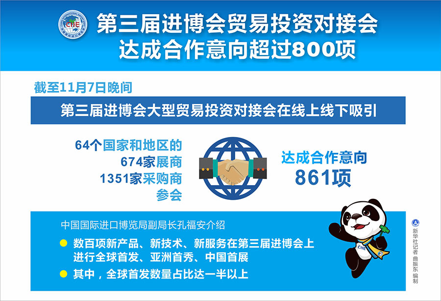 新華社上海11月8日電(記者周蕊、于佳欣)記者8日從第三屆中國國際進(jìn)口博覽會展中新聞通氣會上了解到,截至7日晚間,第三屆進(jìn)博會大型貿(mào)易投資對接會在線上線下吸引64個國家和地區(qū)的674家展商、1351家采購商參會,達(dá)成合作意向861項(xiàng)。