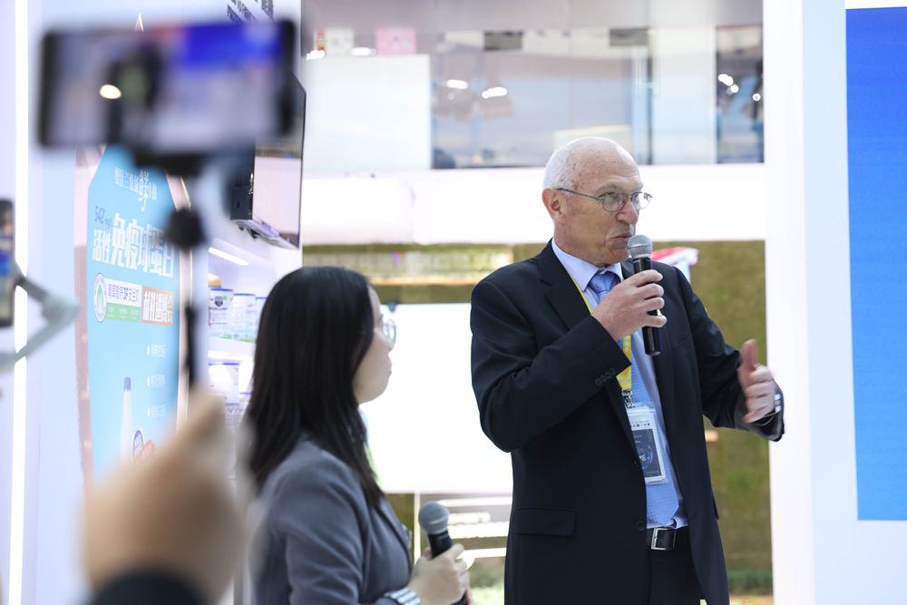 11月7日,羅伊在進(jìn)博會(huì)場(chǎng)館內(nèi)為合作伙伴介紹產(chǎn)品。