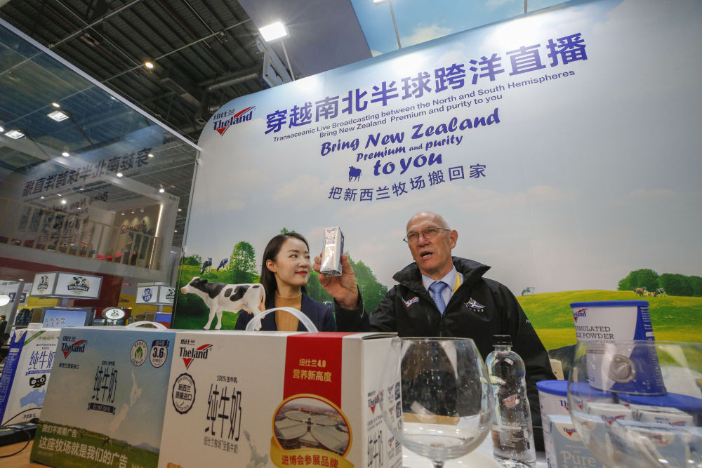 11月5日,羅伊(左一)在進(jìn)博會(huì)上的紐仕蘭乳業(yè)展臺(tái)參加簽約儀式。