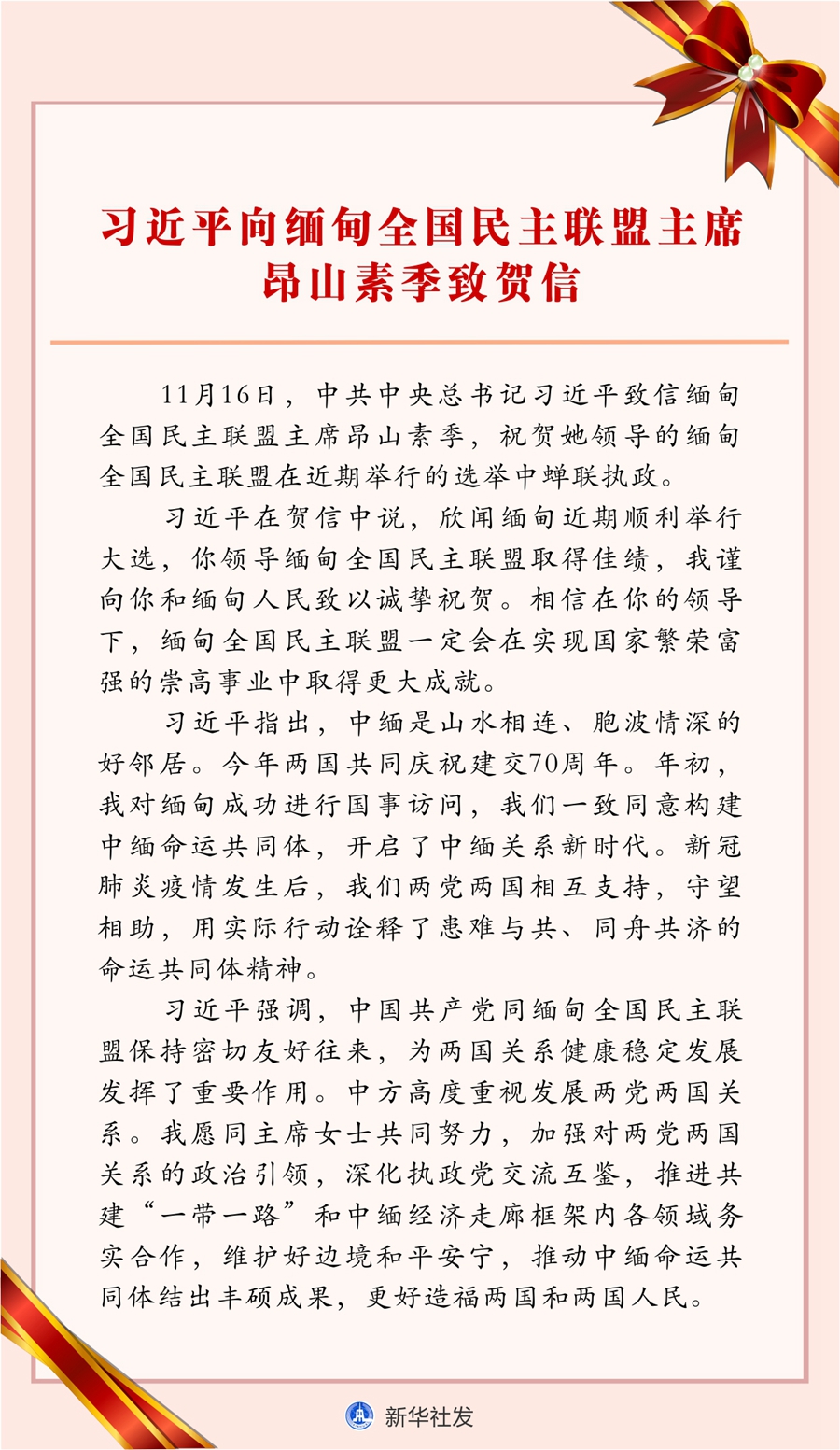 新華社北京11月17日電 11月16日,中共中央總書記習(xí)近平致信緬甸全國(guó)民主聯(lián)盟主席昂山素季,祝賀她領(lǐng)導(dǎo)的緬甸全國(guó)民主聯(lián)盟在近期舉行的選舉中蟬聯(lián)執(zhí)政。